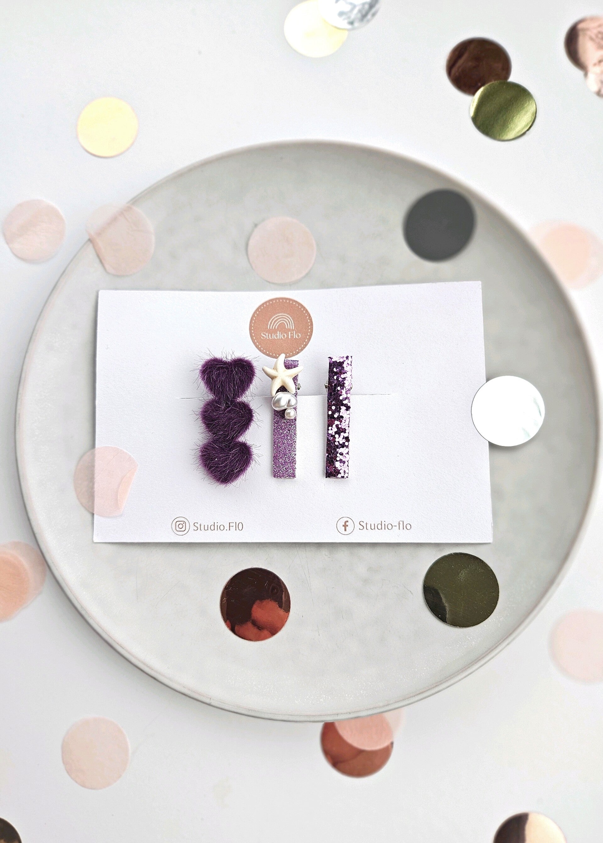 Deze set bevat 3 gouden alligatorspeldjes in 2 maten met telkens een leuke paarse applicatie.