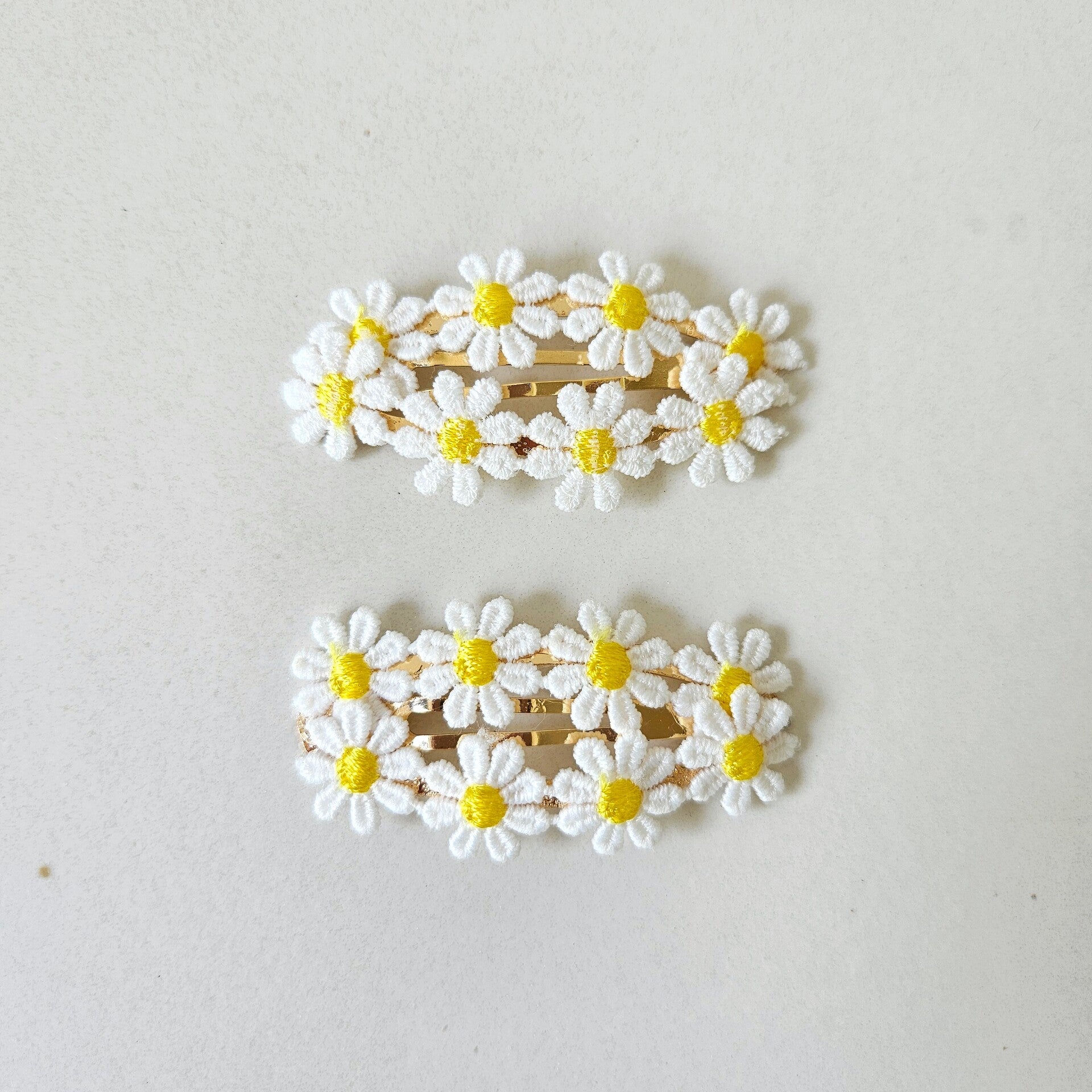 Set van 2 gouden ovalen klikklakspeldjes van 6 cm met een leuke margriet applicatie.