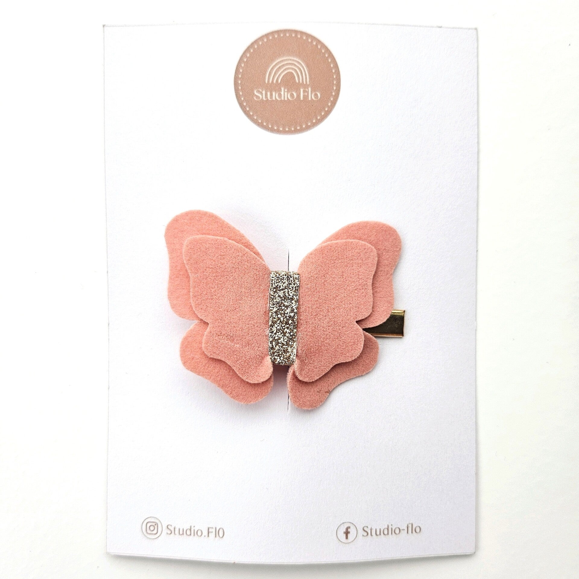 Gouden aligatorclip van 4 cm met roze stoffen vlinder.