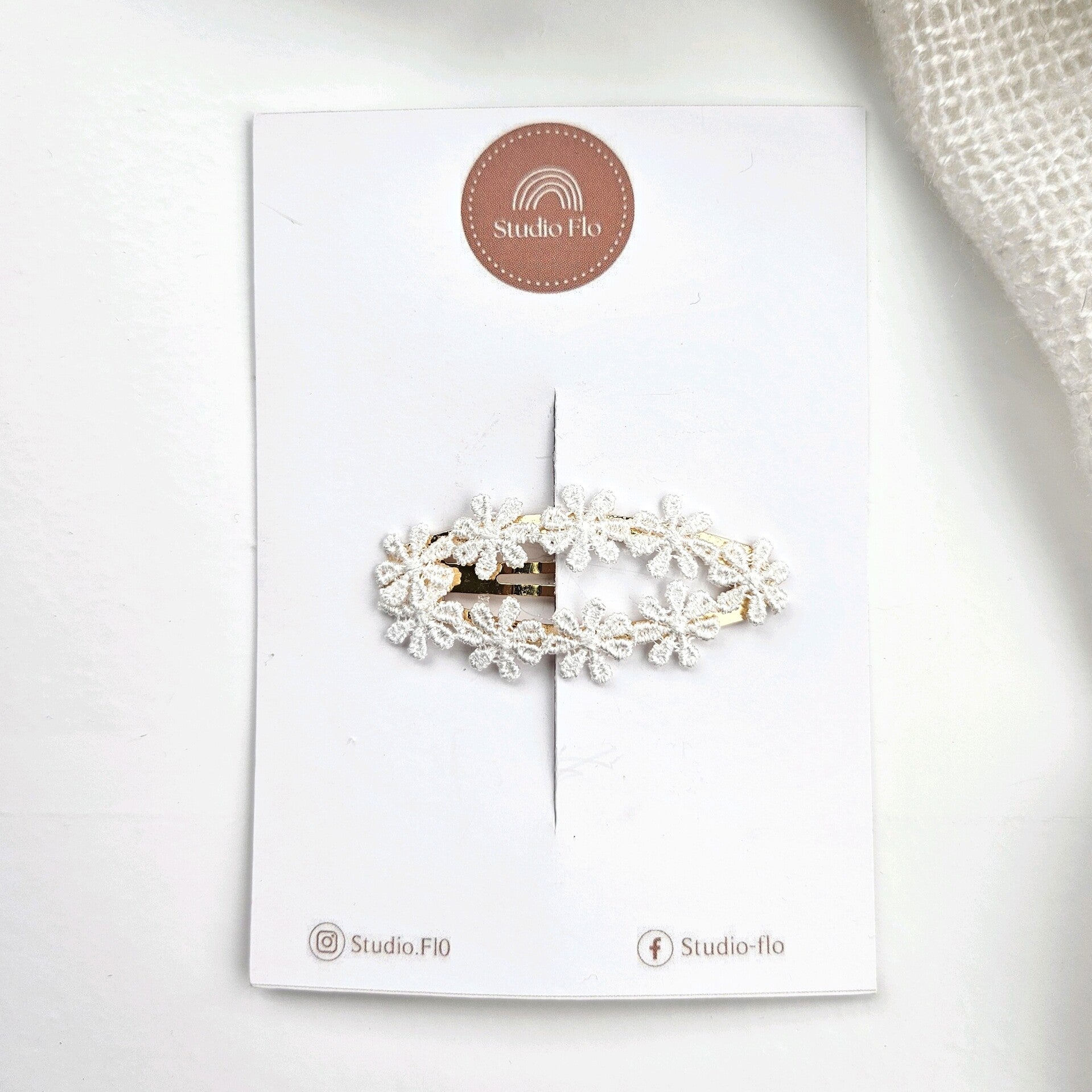 Gouden klikklakspeldje van 6 cm met witte bloemetjes applicatie.