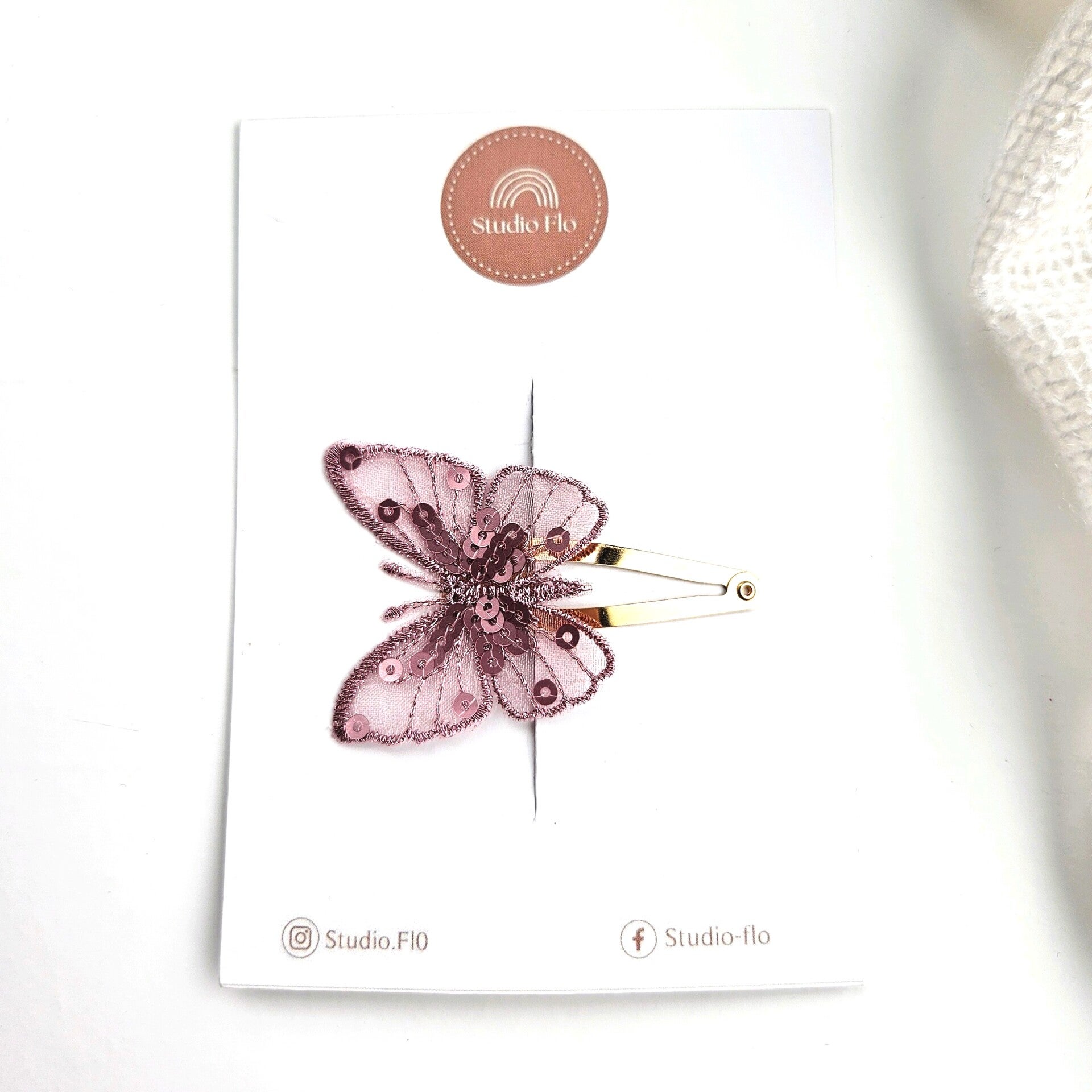 Dit klikklakspeldje van 4 cm is voorzien van een kanten vlinder.