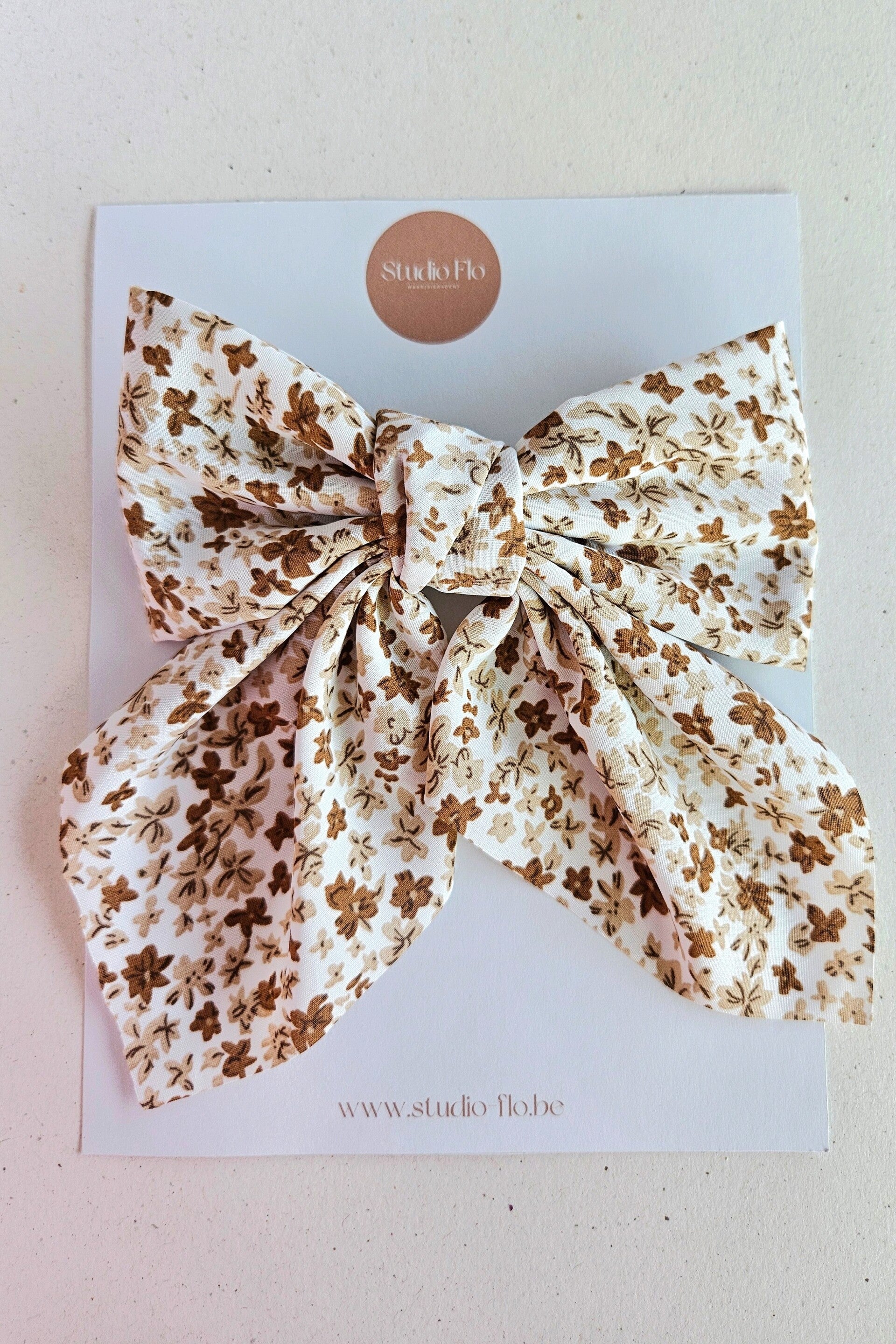 Deze baretteclip is voorzien van een grote stoffen strik met een fijn bloemetjes patroon.