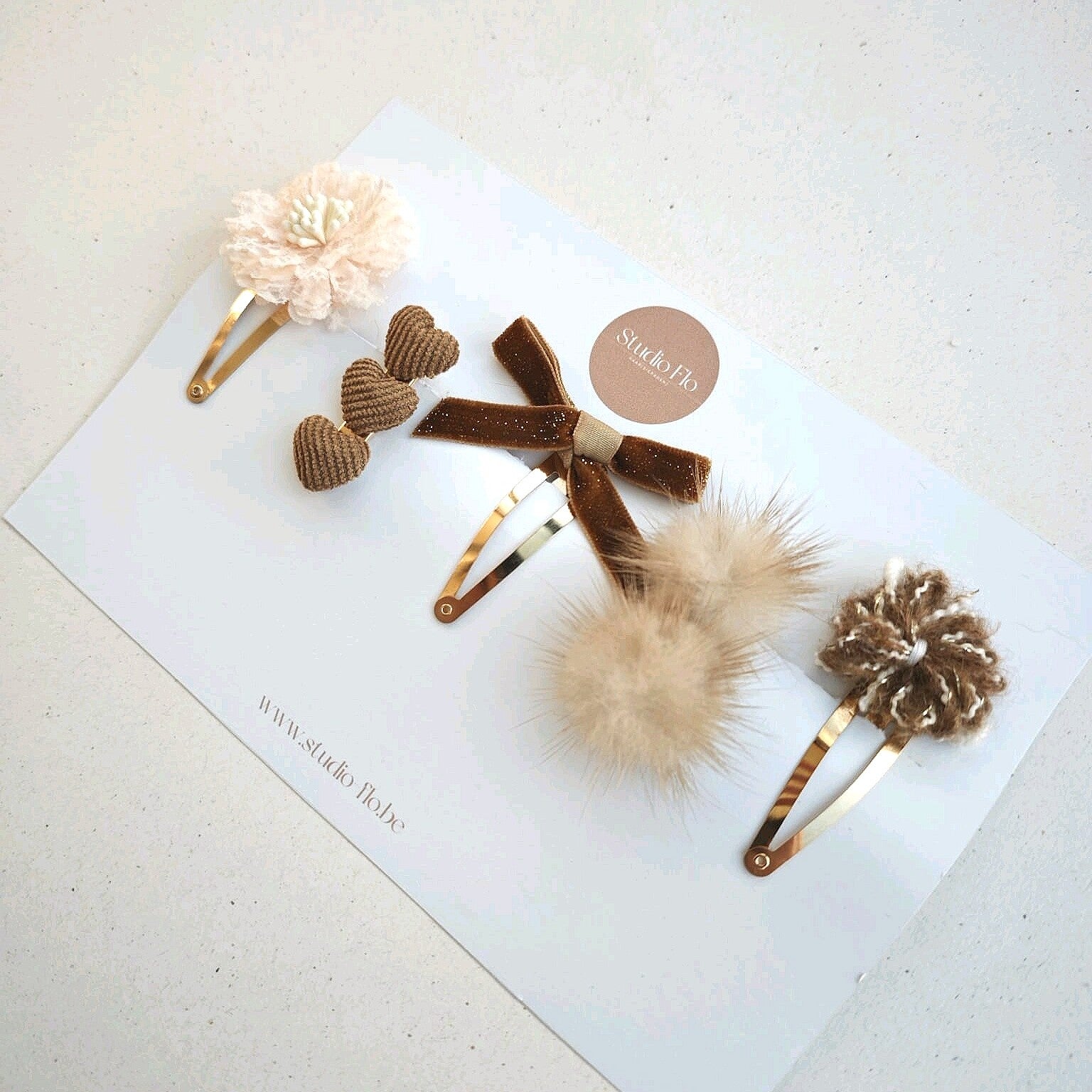3 klikklakspeldjes en 2 alligatorclipjes elk met hun eigen mooie applicatie zoals te zien op de productfoto.