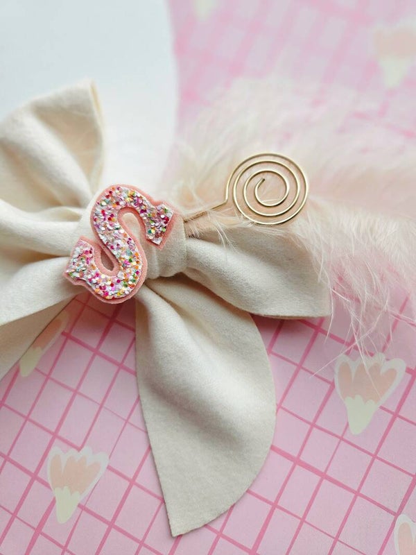 Kleur: witte strik,gouden/zilver staf,beige veer